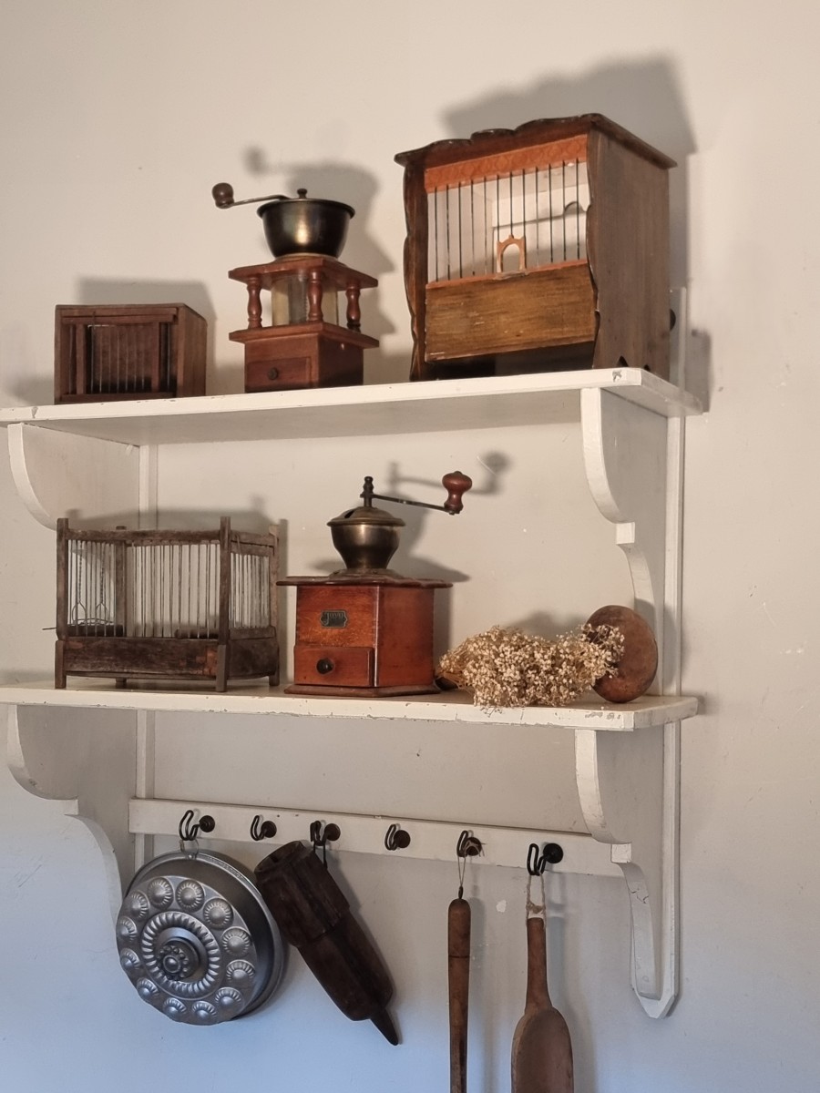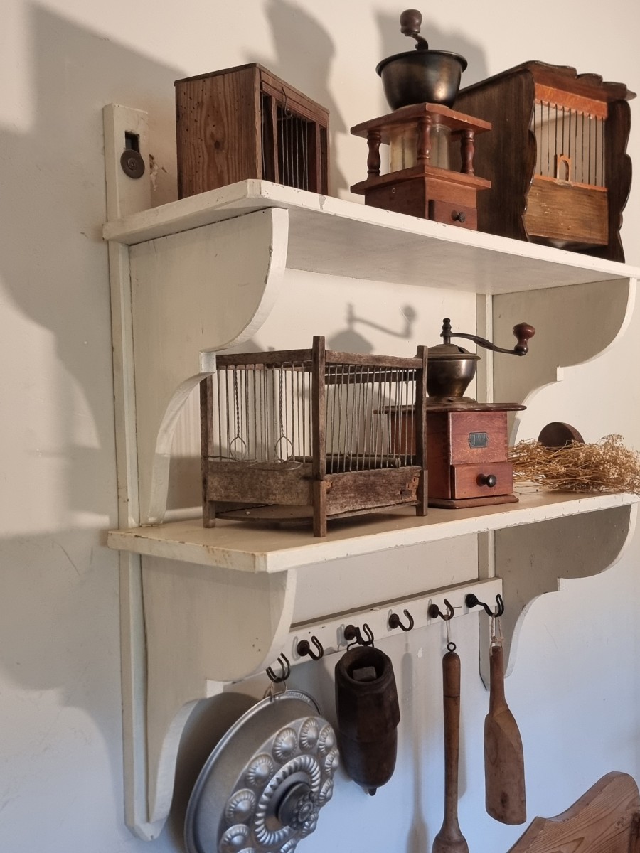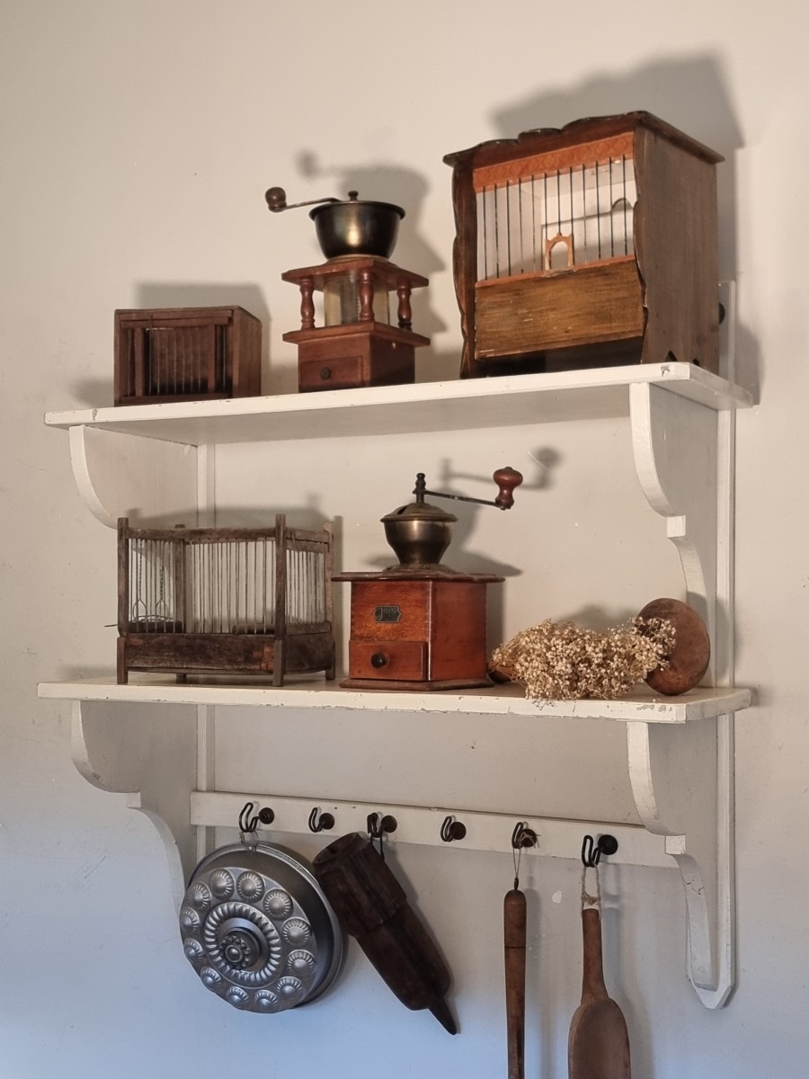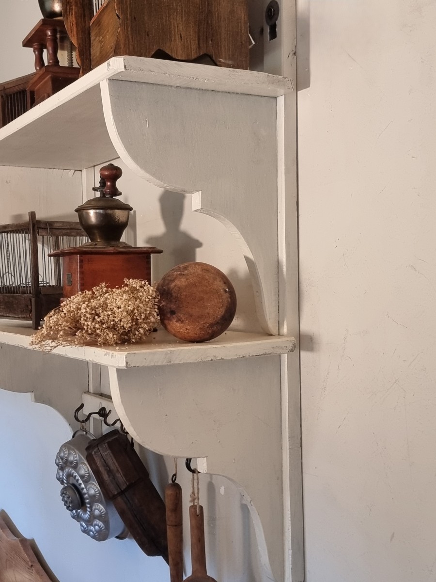 Prachtig brocant wit regaal/keukenrek in landelijke stijl. Het rek is stevig, sierlijk afgewerkt en perfect om sfeer toe te voegen aan je keuken, woonkamer of hal. Ideaal voor het uitstallen van servies, kruidenpotjes, decoratie of andere mooie vondsten.