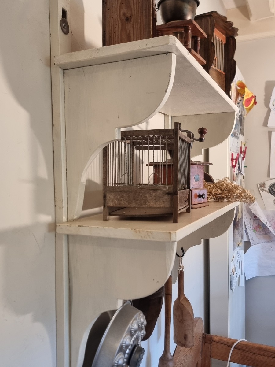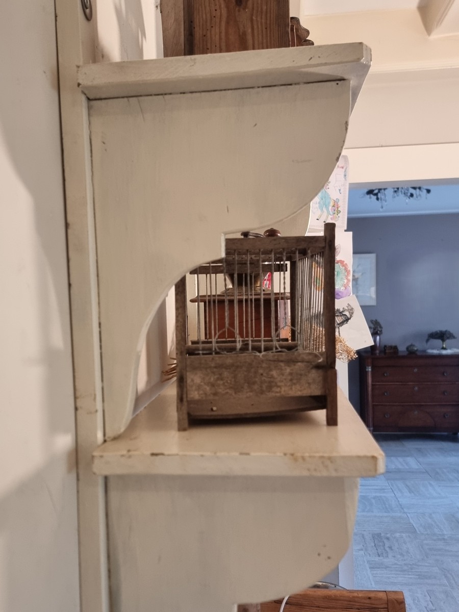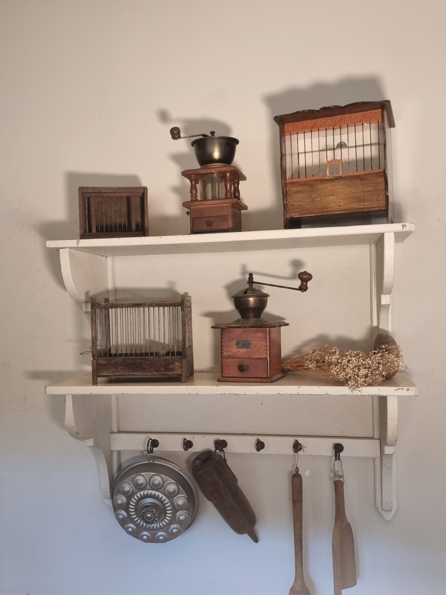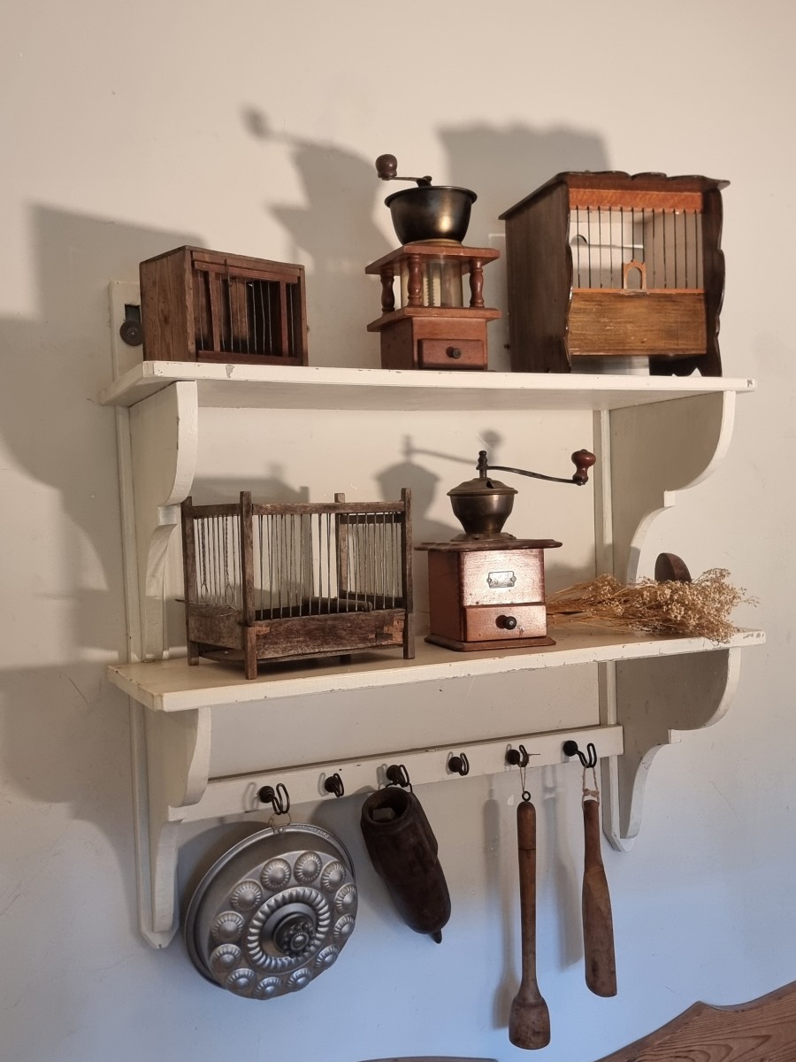 Prachtig brocant wit regaal/keukenrek in landelijke stijl. Het rek is stevig, sierlijk afgewerkt en perfect om sfeer toe te voegen aan je keuken, woonkamer of hal. Ideaal voor het uitstallen van servies, kruidenpotjes, decoratie of andere mooie vondsten.